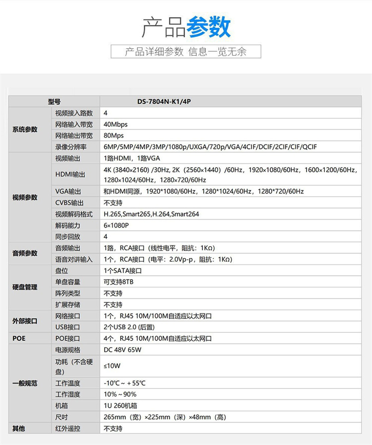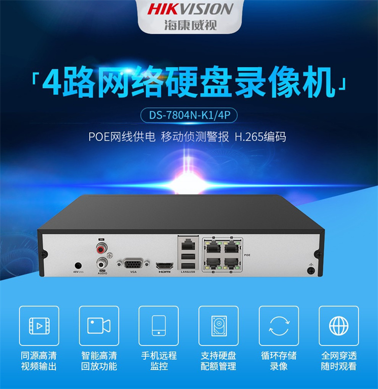 ??低?DS-7804N-K1/4P ??低暰W(wǎng)絡(luò)監(jiān)控硬盤錄像機4路POE網(wǎng)口 不帶硬盤